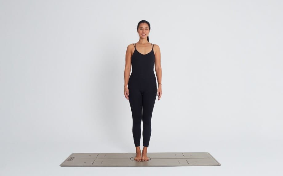 Descripción: Ponte de pie con los pies juntos, los brazos a los lados del cuerpo y las palmas hacia adelante. Mantén la columna recta y respira profundamente.