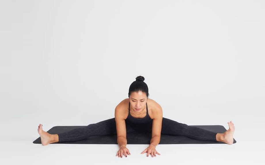 Descripción: Siéntate en el suelo con las piernas abiertas en forma de “V”. Inclínate hacia adelante desde las caderas manteniendo la espalda recta.